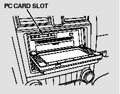 The PC card slot is behind the navigation screen. To use the PC card player, press the OPEN button beside the screen. The screen folds back, and the PC card slot appears.